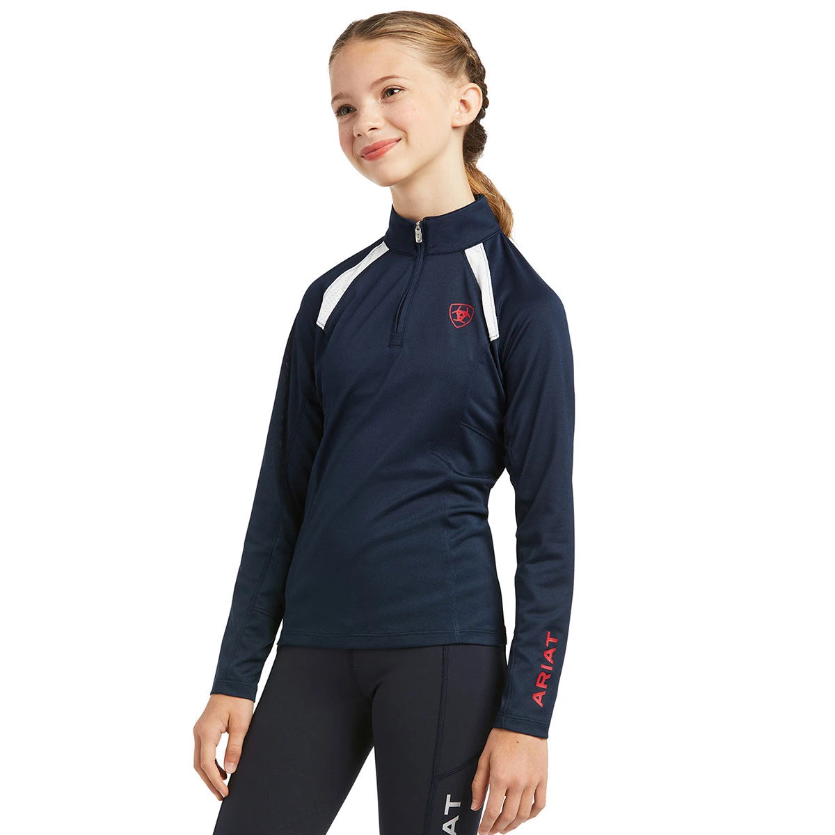 Ride comfortably and stylish in the Ariat Sunstopper 2.0 Girls Quarter Zip- Team print. This lightweight and breathable later keeps you cool and protected from the sun. Featuring UPF 50+ sun protection, ClimateTEK cooling material and FreshTEK odor resistance, this quarter zip is perfect for those warm spring days in the barn or in the saddle.