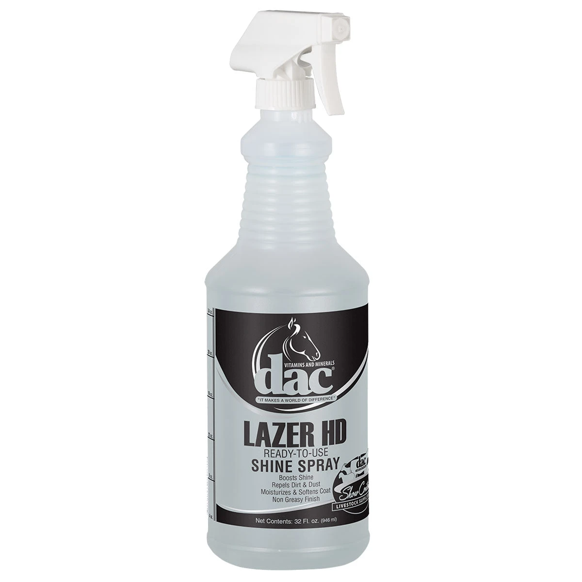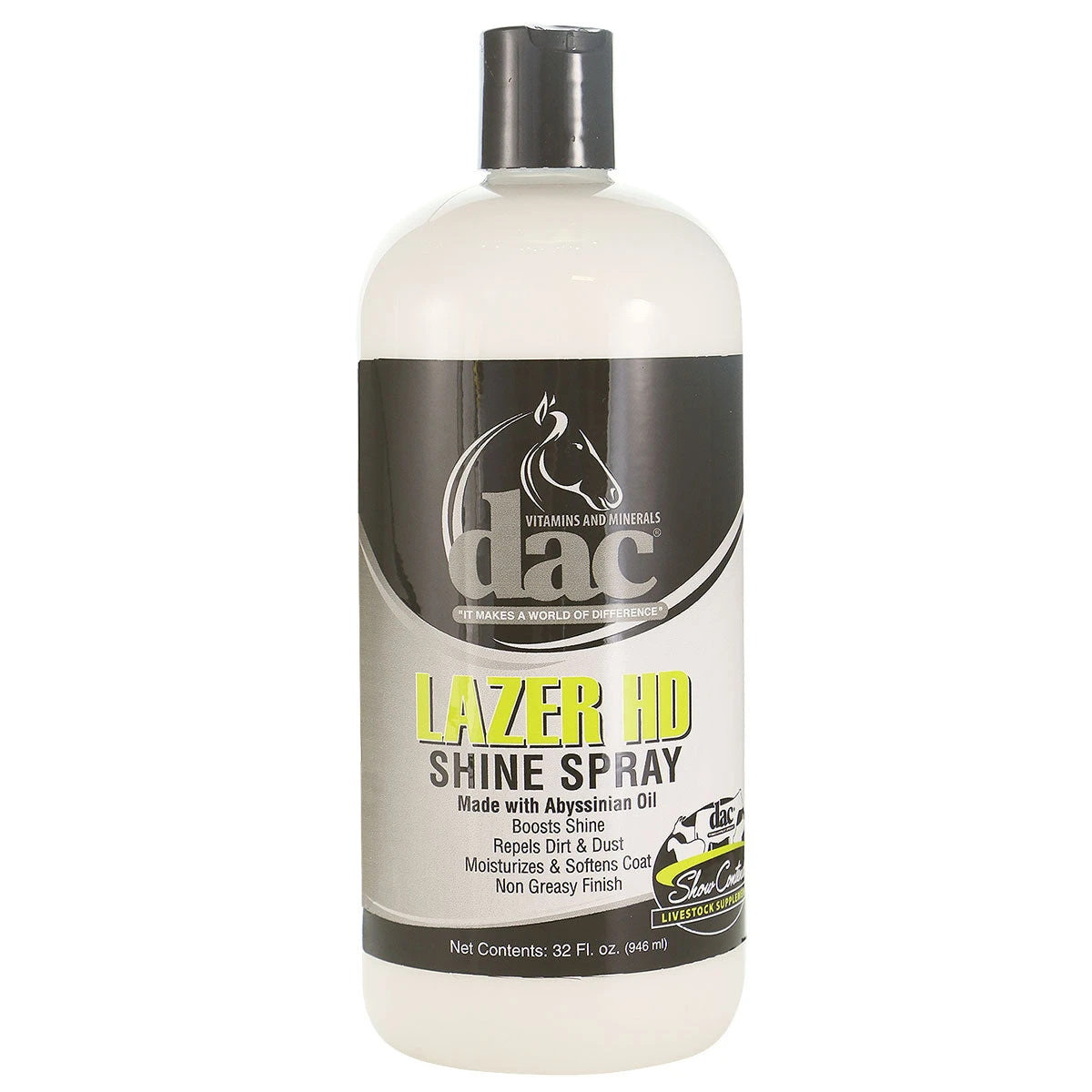 Concentrated Lazer HD Shine Spray that reduces grooming times, detangles and provides showring shine by dac. Lazer HD nourishes the coat while making it more manageable and eliminating static fly aways. Formulated with Glycerin and Vitamin E and Abyssinian Oil. These ingredients work to restore and maintain the skin’s moisture barrier, providing hair a rich shine and glossy feel. Vitamin E also works to protect against damaging free radicals. dac’s formula is designed with rich emollients and gloss that helps provide a lasting lazer shine. Concentrated formula.