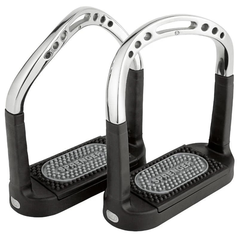 Offer a modern design in silver and black that provides perfect balance to set your leg in the correct riding position, these shock absorbing stirrups support the release of the foot in case of an accident and are also positioned to relieve stress on the ligaments and joints.