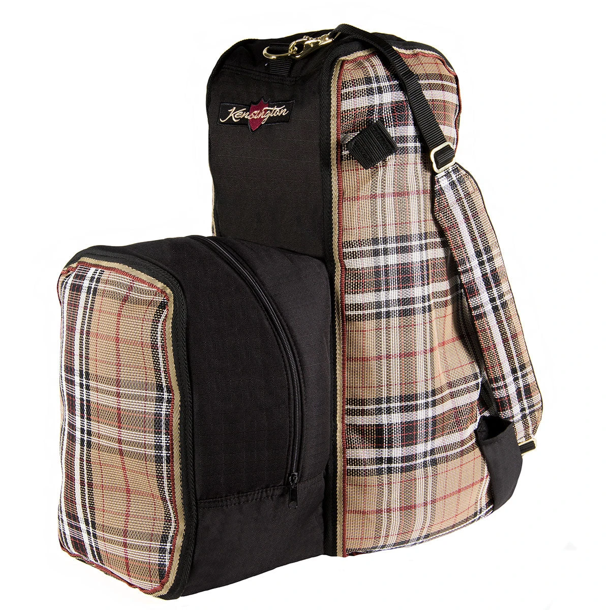 Kensington’s premium Signature Collection Padded Boot and Helmet Carrier offers a stylish solution for storing, packing and protecting your boots. Protect your boots at home or on the road, and keep all your gear together and organized with this multi-compartment bag. The boot compartment measures 22″ tall and has a center divider to keep boots from rubbing and scuffing. The handy front compartment safely stores a helmet and there’s a crop holder on the side of the boot compartment. It features a hard plastic bottom with rubber guards and a padded shoulder strap for extra strength and comfort.