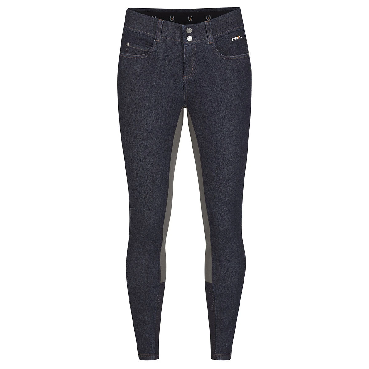 The Kerrits Stretch Denim Full Seat Ladies Breech takes everything you love about your favorite jeans and put them into your new favorite breech! Crafted from technical stretch denim infused with DriRelease technology, these breeches will pull perspiration away from the skin to the exterior of fabric so it can evaporate quickly instead of sticking to your legs. The contoured waistband will be equal parts comfort and pristine fit, combined with excellent stretch throughout the hip, thighs and legs, ensuring the shape and fit will remain the same – wash after wash. GripSoft patches move and flex with you from two point to sitting trot.