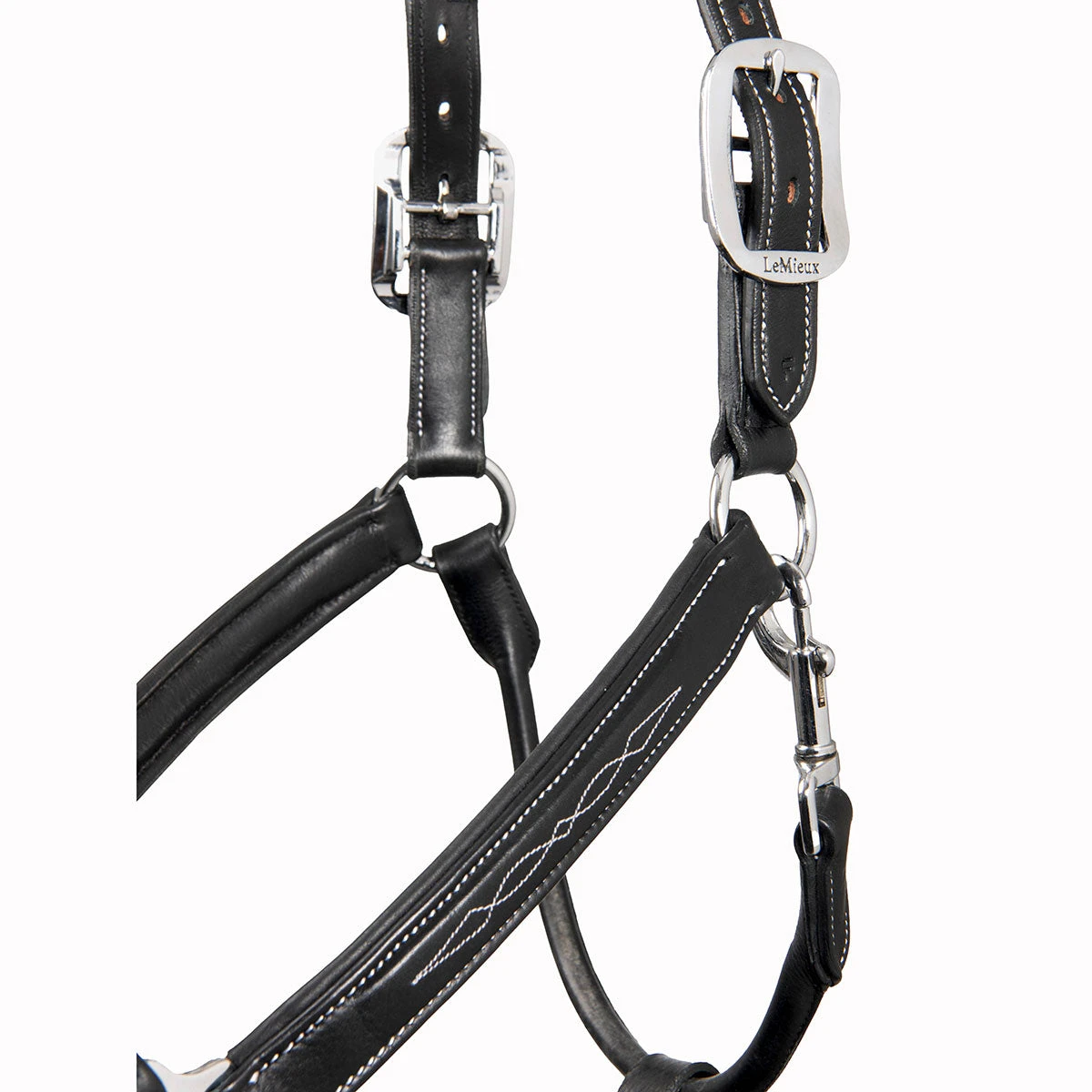Anatomically shaped Leather Halter by LeMieux. This high quality padded halter has elegant stitching detail for a classic look. Featuring anatomically shaped crown and noseband to provide complete comfort to the horse. Also features double adjustable crown piece and adjustable chin strap for ideal fit. The LeMieux Leather Halter has solid metal hardware with subtle LeMieux branding.