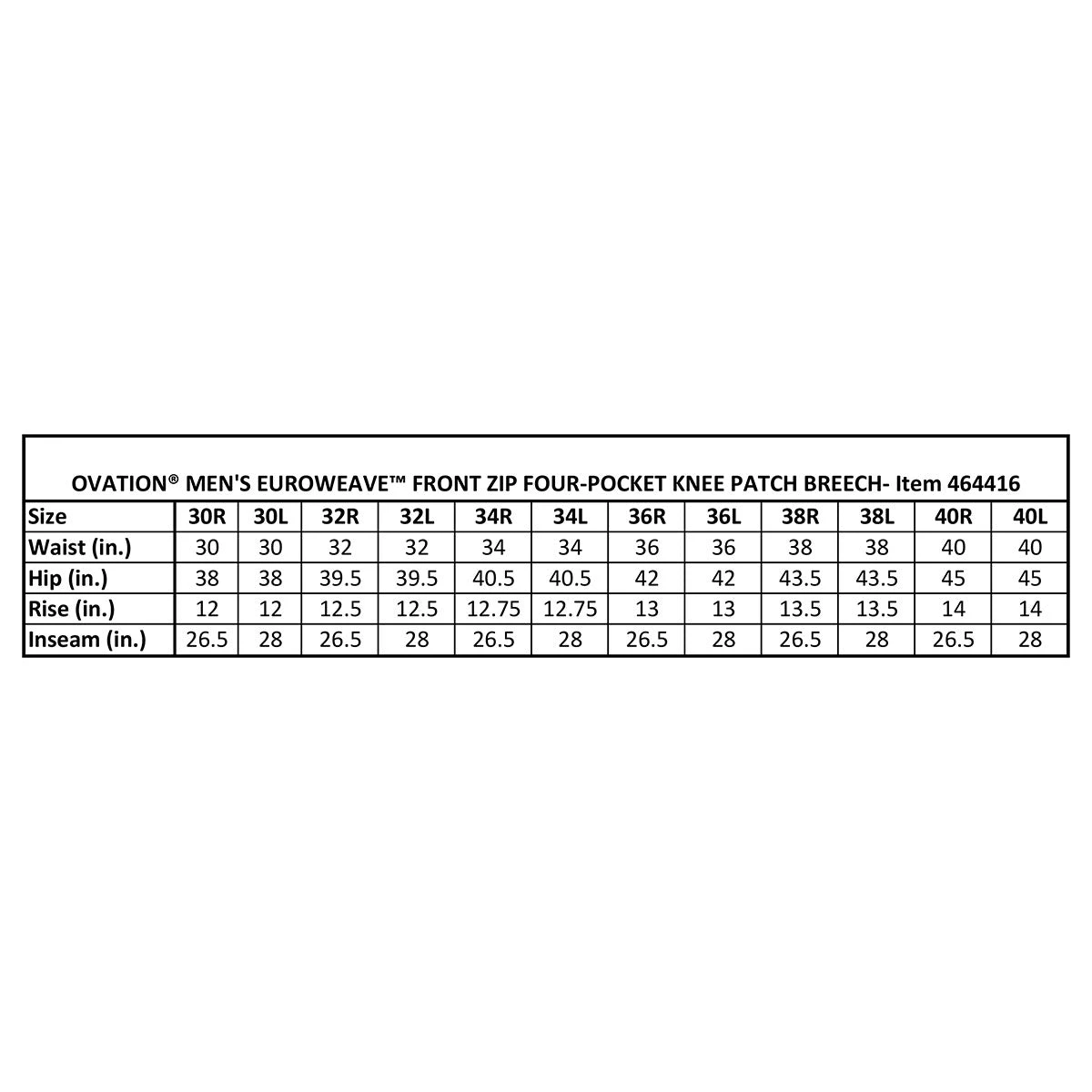 Ovation Mens EuroWeave Knee Patch Breeches are constructed from patented EuroWeave Ovation fabric, these breeches provide excellent support and comfort, while smoothing and concealing in and out of the saddle. A slightly relaxed fit with a mid rise waist and contoured ankles, the EuroWeave breech combines a soft, durable, non-pilling finish with long lasting shape retention and wrinkle resistant properties, plus UPF 50+ protection. An excellent breech with superior value for schooling or showing.