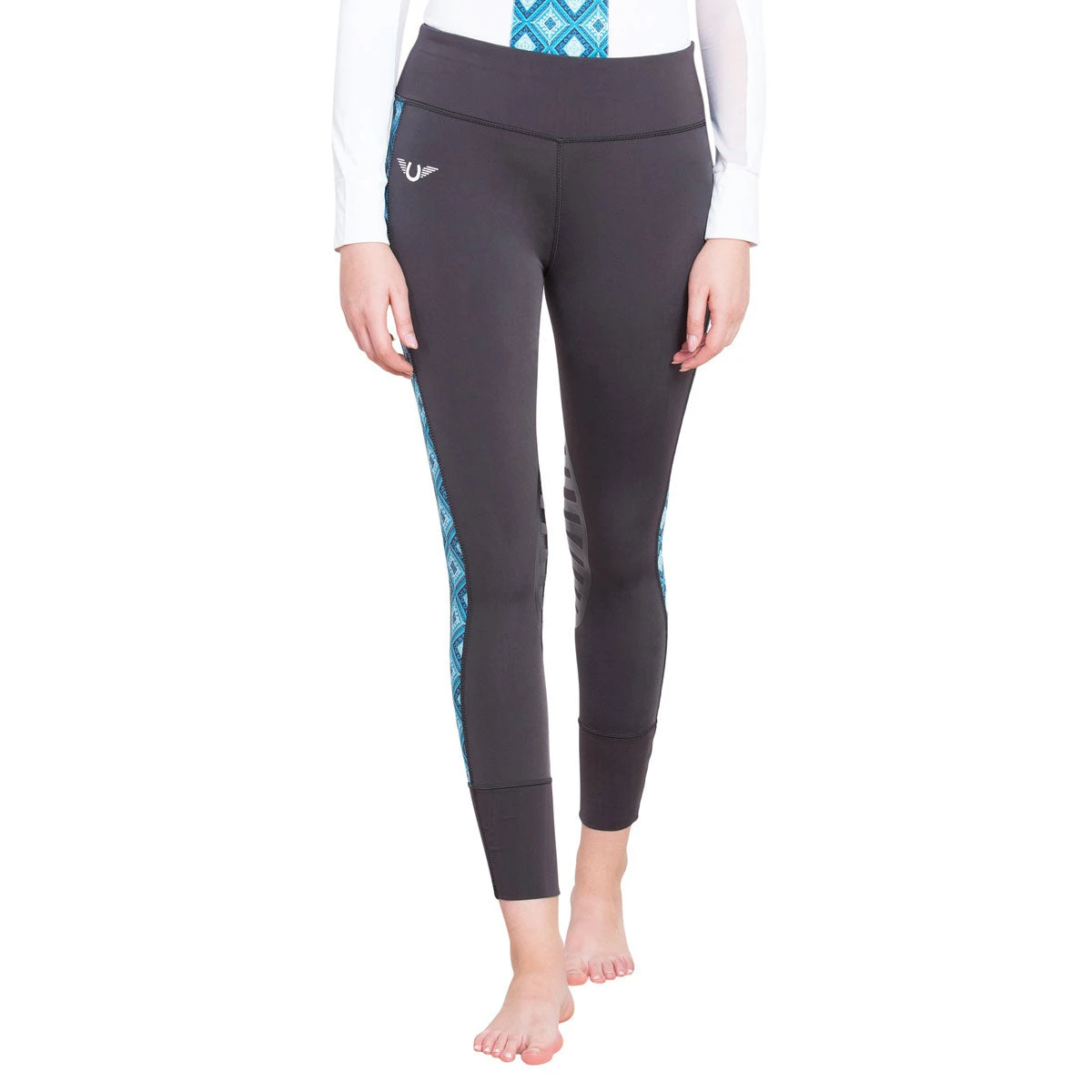 The TuffRider Artemis EquiCool Ladies Riding Tights were created to be equal parts functional and comfortable. The light, stretchy fabric is made from a micro nylon/spandex mix infused with EquiCool to pull moisture away from the body and offer 50+ UV protection. Additional features include modern silicone knee patches for a secure grip in the saddle, contoured sock bottoms for a seamless fit under boots, and a convenient back zipper pocket.